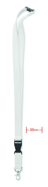 Lanyard with metal hook, detachable buckle and safety breakaway. 20 mm wide.